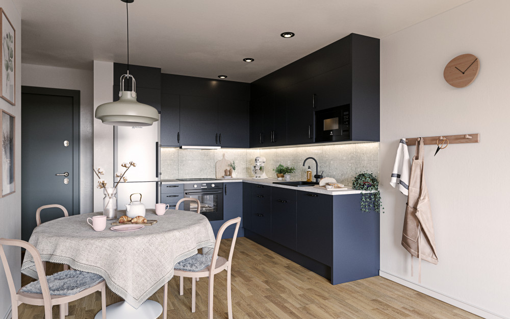 Här bor du i moderna lägenheter med hög standard och inredning från kända varumärken såsom Kährs, Marbodal och Electrolux. Huset har hiss för högsta bekvämlighet och lägenheterna har öppna, moderna planlösningar. Lägenheternas inredning är satt för att passa de flesta, men här finns även utrymme att göra inredningsval på de platser du känner för att ta ut svängarna. De val du kan göra hittar du i Brf Älvshöjdens inredningskatalog.
